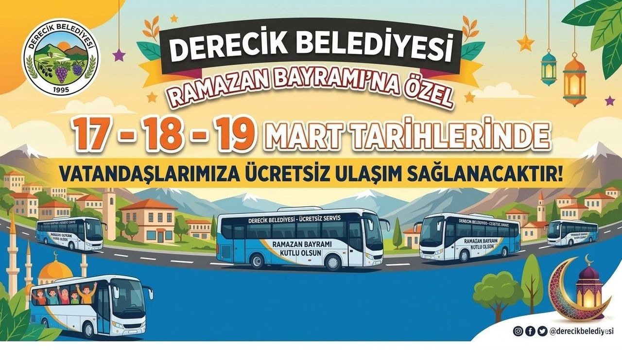 Belediye tarafından yapılan duyuruda, 17, 18 ve 19 Mart tarihlerinde ilçe genelindeki ulaşım araçlarının vatandaşlara ücretsiz hizmet vereceği ifade edilerek tüm Derecik halkının Ramazan Bayramı şimdiden kutlandı.