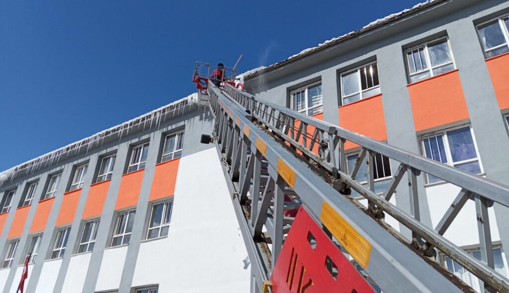 Hakkari’de etkisini sürdüren şiddetli soğuklar, çatı saçaklarında tehlikeli buz sarkıtlarının oluşmasına neden olurken, Hakkari Belediyesi İtfaiye Müdürlüğü ekipleri özverili çalışmalarıyla öğrencilerin güvenliğini sağladı.