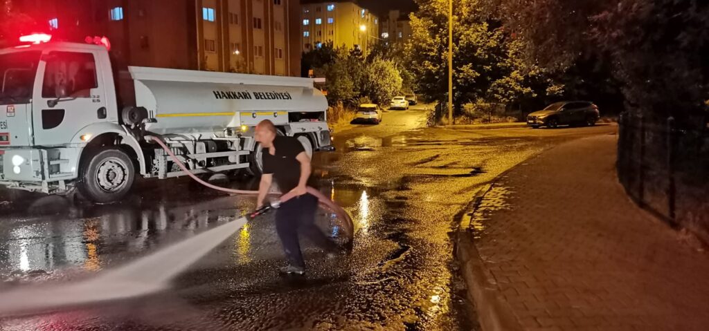 Akşam saatlerinde Hakkari Belediyesi’ne ait su tankerinin hortumunu bizzat eline alan Muhtar Aksaç, Sümbül Mahallesi Tekser TOKİ Konutları’nda temizlik çalışması başlattı. Toz, çamur ve biriken atıklara karşı mücadele eden Aksaç, “Temiz bir mahalle, huzurlu bir yaşam demektir” mesajını güçlü bir şekilde verdi.