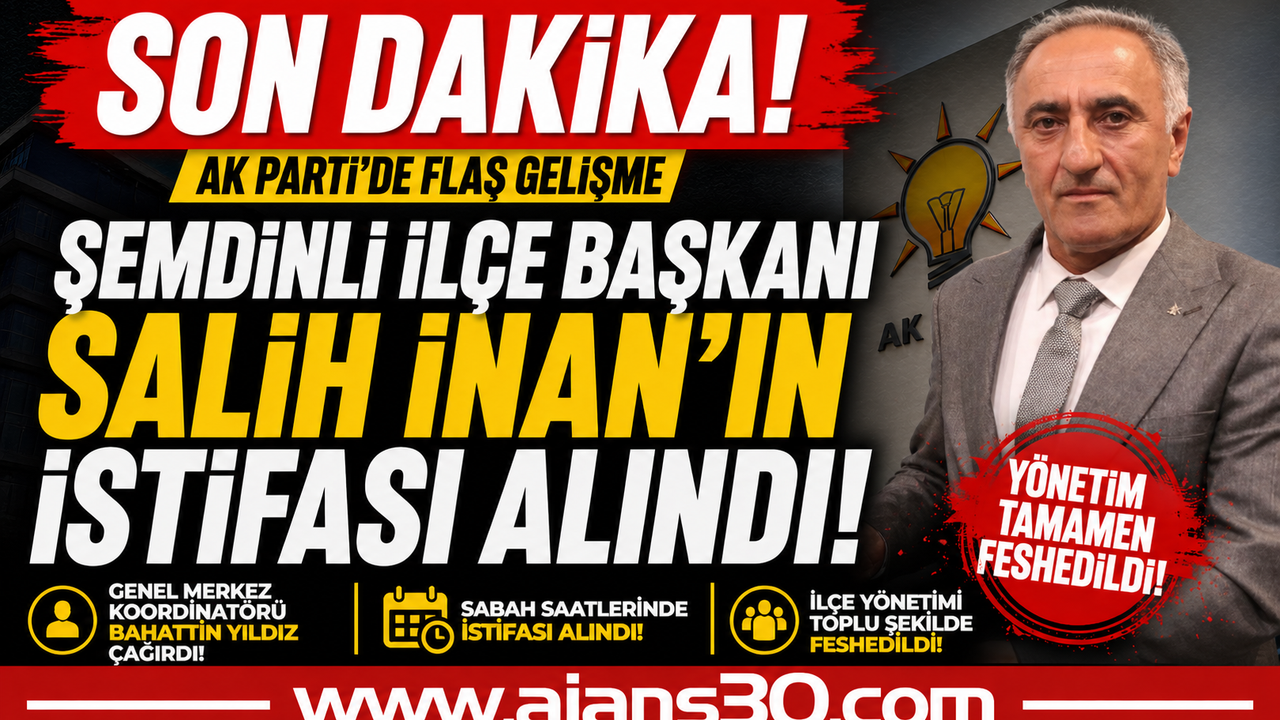 Edinilen bilgilere göre, AK Parti Genel Merkez İl Koordinatörü Bahattin Yıldız tarafından Hakkâri merkeze çağrılan İlçe Başkanı Salih İnan’ın, sabah saatlerinde istifası alındı. Yaşanan bu gelişmenin ardından ilçe teşkilatının mevcut yönetimi de görevden alınarak feshedildi.