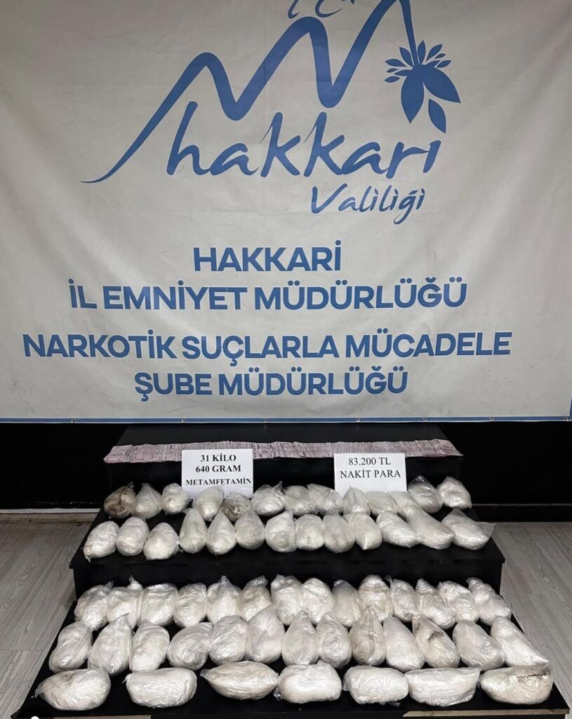 Hakkari İl Emniyet Müdürlüğü Narkotik Suçlarla Mücadele Şube Müdürlüğü ekipleri, 21 Ekim 2025 tarihinde düzenledikleri operasyonda 60 parça halinde 31 kilo 640 gram metamfetamin maddesi ele geçirdi. Olayla bağlantılı 3 şüpheli gözaltına alınarak adli makamlara sevk edildi.