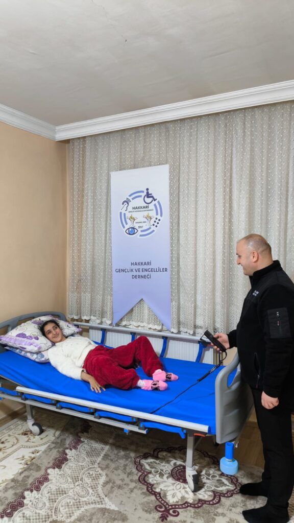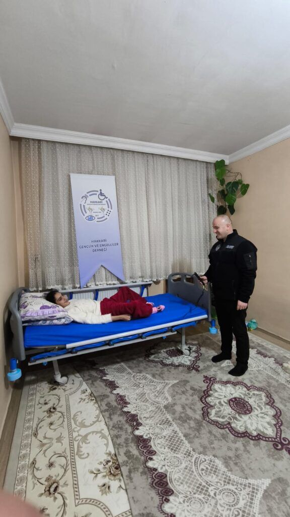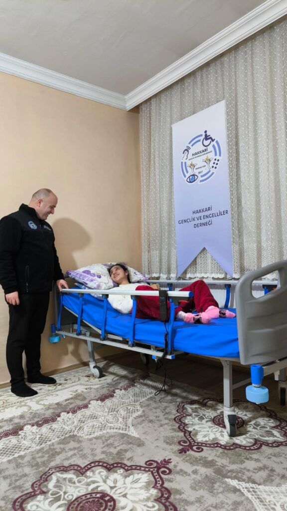 Hakkari Gençlik ve Engelliler Derneği Başkanı Yavuz ve Aydoğdu Hakkari'nin Yüksekova Şemdinli ve Derecik ilçelerin'de ikamet eden ihtiyaç sahibi Ağır engelli ÖZEL Gereksinimli olan 3 vatandaşa daha ( 2 Adet Elektrikli Hasta yatağı ve kelebek hastası için Krem ve medikal malzemeleri hediye etti.