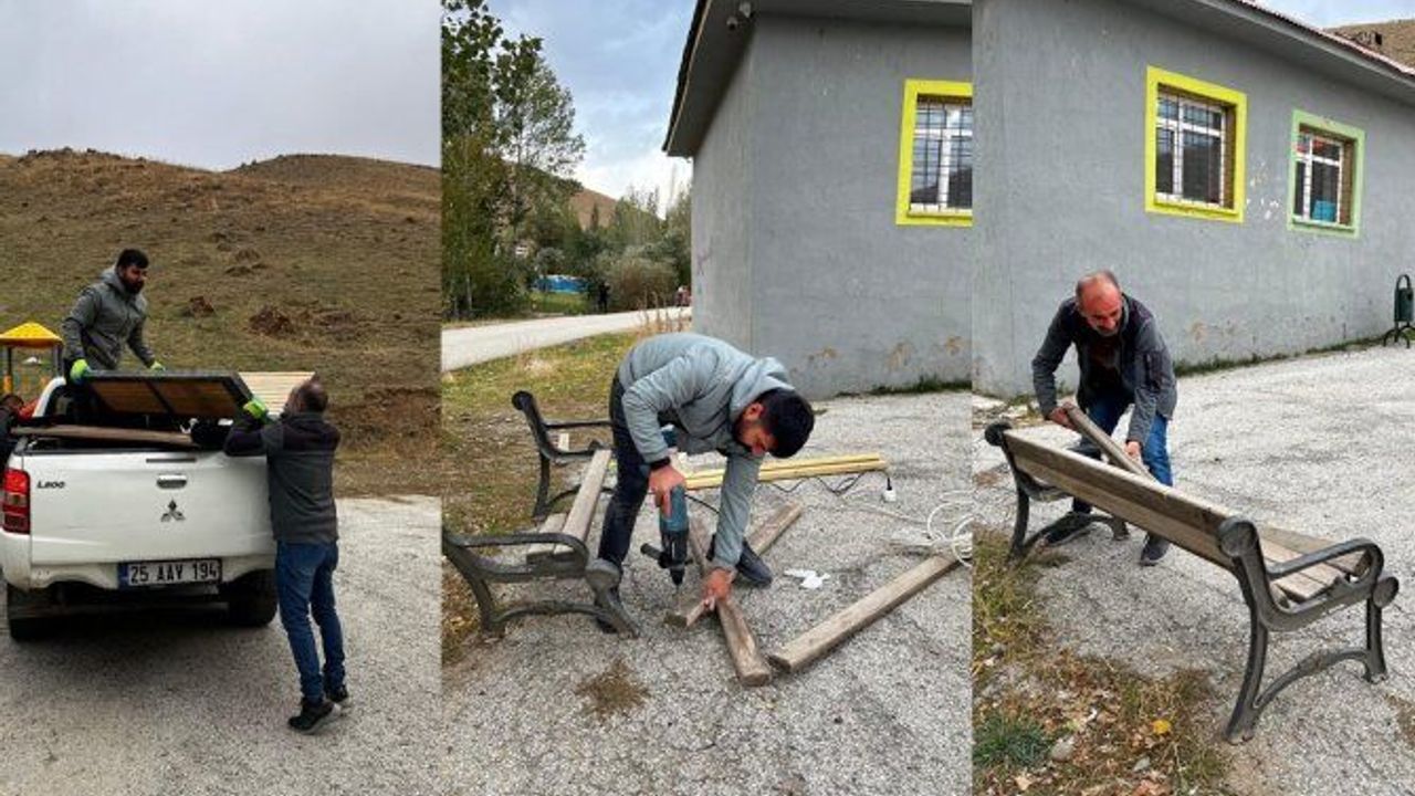 Okul bahçesinde tahrip olan banklar tamir edilerek, yenileri ilave edildi. Ekipler hafif kar yağışına rağmen akşam saatlerine kadar çalışmalarını sürdürdü. Okul bahçesi oturma banklarının onarım ve bakımı yapılarak, yenileri eklendi ve çöp kutuları yenilendi.