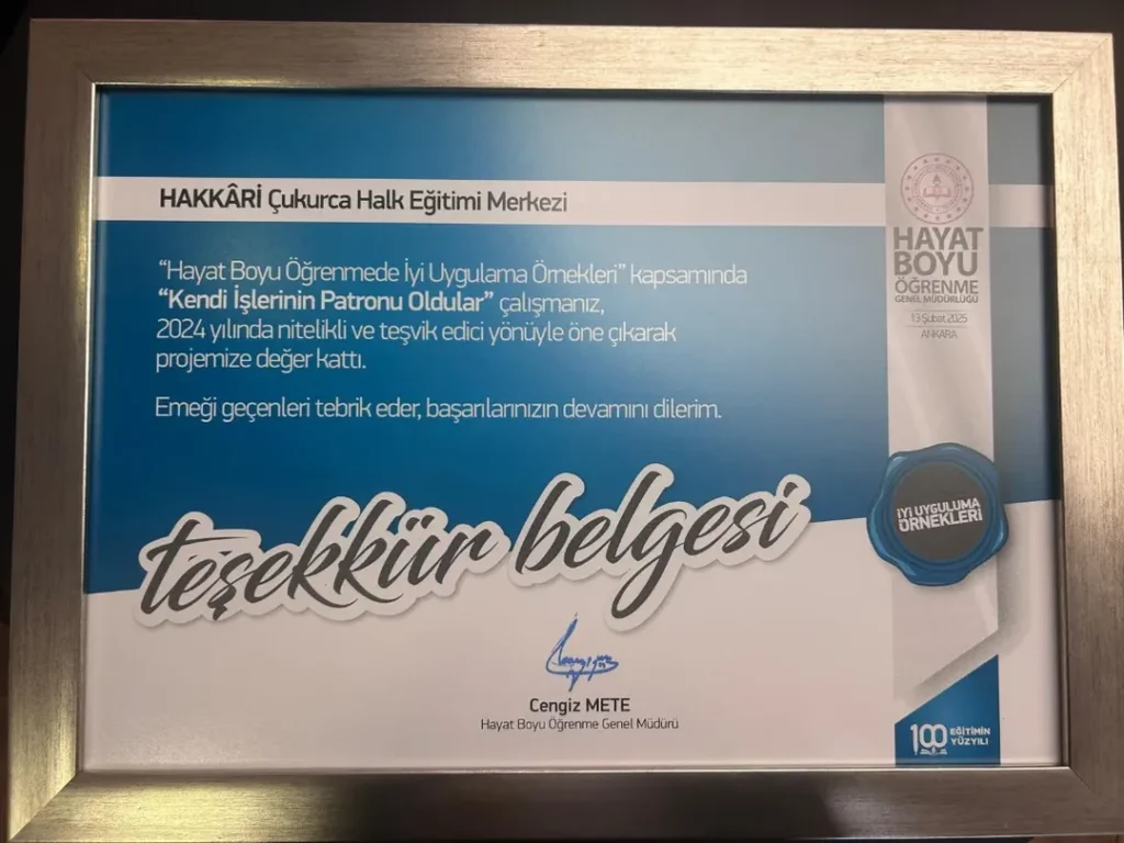 Çukurca Halk Eğitimi Merkezi, "Kendi İşlerinin Patronu Oldular" adlı çalışmasıyla Milli Eğitim Bakanlığı tarafından düzenlenen "Hayat Boyu Öğrenmede İyi Uygulama Örnekleri" programında ödüle layık görüldü. Ankara’da gerçekleştirilen ödül töreninde Çukurca Halk Eğitimi Merkezi, başarılı çalışmalarıyla teşekkür belgesi aldı.