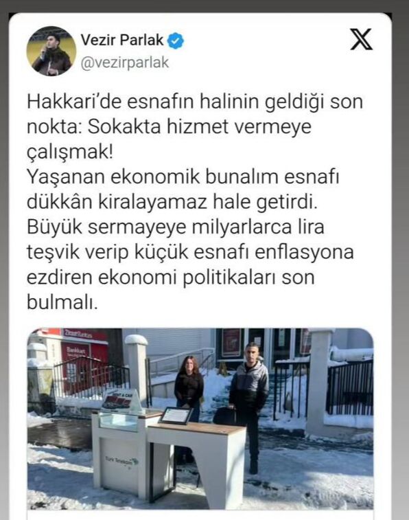 DEM Parti Hakkâri Milletvekili Vezir Parlak, sosyal medya hesabından yaptığı paylaşımda Hakkâri’de küçük esnafın artan kira bedelleri ve yüksek maliyetler nedeniyle dükkân tutamaz hale geldiğini savundu. Parlak, “Hakkâri’de esnafın halinin geldiği son nokta: Sokakta hizmet vermeye çalışmak” ifadelerini kullanarak, büyük sermayeye verilen teşviklere karşın küçük esnafın enflasyon karşısında korumasız bırakıldığını öne sürdü.