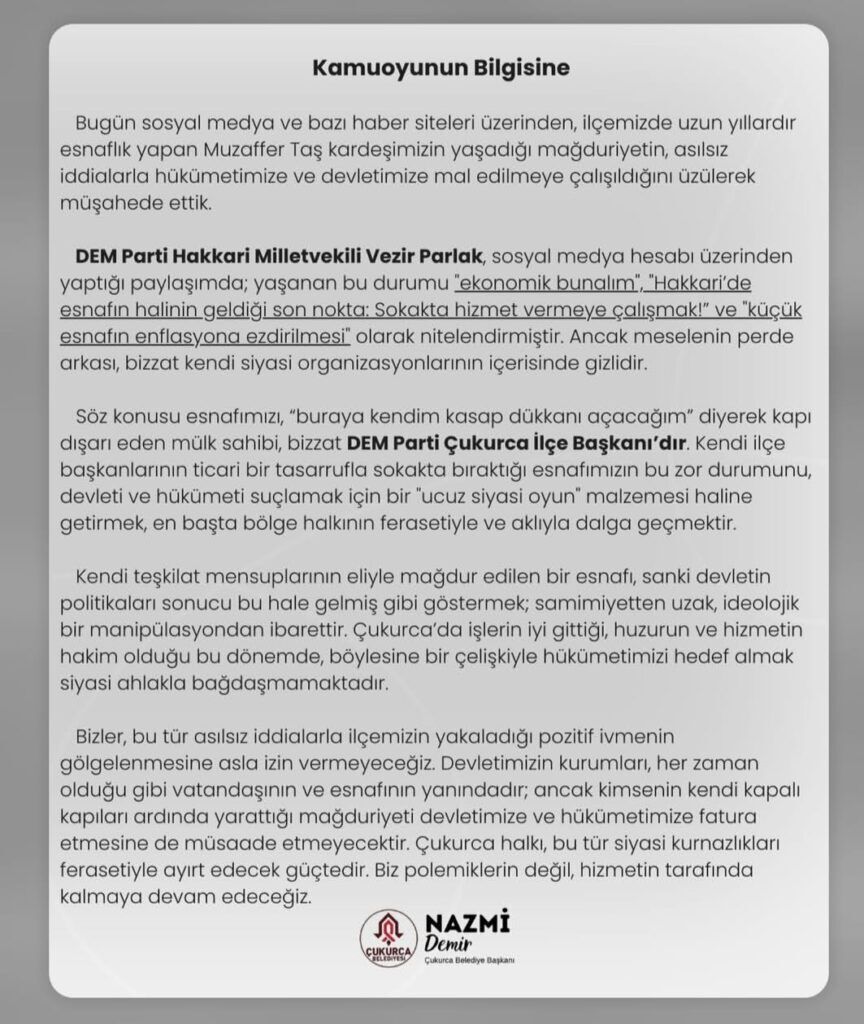 DEM Parti cephesinden gelen eleştirilerin ardından Çukurca AK Parti Belediye Başkanı Nazmi Demir, “Kamuoyunun Bilgisine” başlığıyla yazılı bir açıklama yayımladı. Demir, söz konusu esnafın yaşadığı mağduriyetin hükümet ve devlet politikalarıyla ilişkilendirilmesini gerçek dışı olarak nitelendirdi.