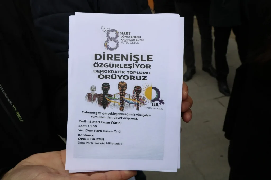 Dağıtılan broşürlerde yer alan bilgilere göre, 8 Mart etkinlikleri kapsamında düzenlenecek yürüyüş saat 13.00’te DEM Parti Hakkari İl Örgütü binası önünde başlayacak. Yürüyüşe Öznur Bartın’ın da katılmasının beklendiği belirtildi.