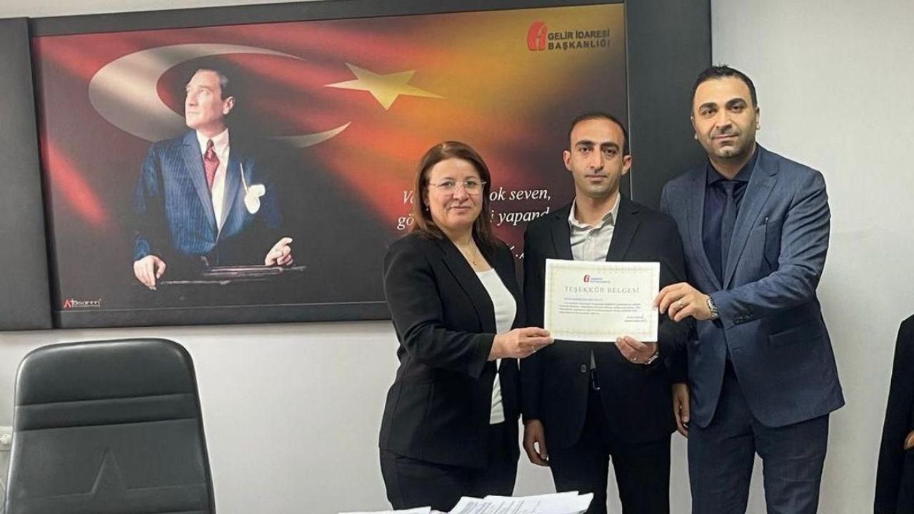 Gelir İdaresi Başkanlığı tarafından takdim edilen teşekkür belgesi, Hakkâri Vergi Dairesi Müdürü Sayın Hacer Ersoy, Gelir Uzmanı Sayın Veysel Öktem ve tüm vergi dairesi çalışanlarının katkılarıyla tevdi edildi.