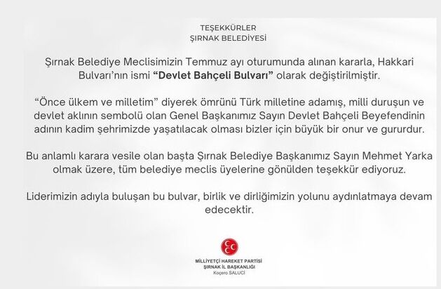 Şırnak Belediyesi, temmuz meclis toplantısında aldıkları kararla Hakkari Bulvarı'nın adı ''Devlet Bahçeli Bulvarı'' olarak değiştirdi.
