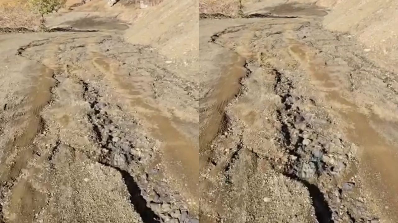 Görüntülerde, toprak zeminin yağışın etkisiyle derin yarıklar oluşturduğu, çamurun araç geçişini zorlaştırdığı açıkça görülüyor.