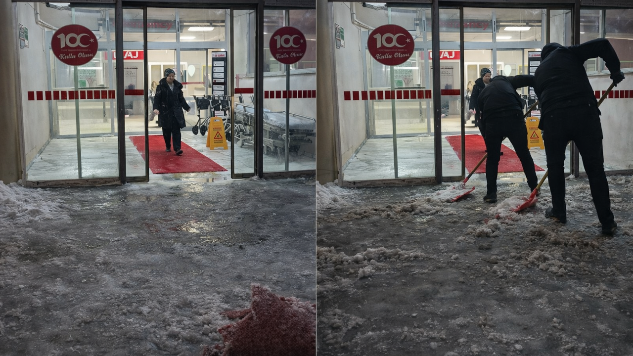 Hastane önünde oluşan buzlanma, özellikle acil servise giriş-çıkış yapan hastalar ve sağlık çalışanları açısından tehlike yaratırken, ilgili ekipler tarafından kısa sürede temizlik çalışması yapıldı.