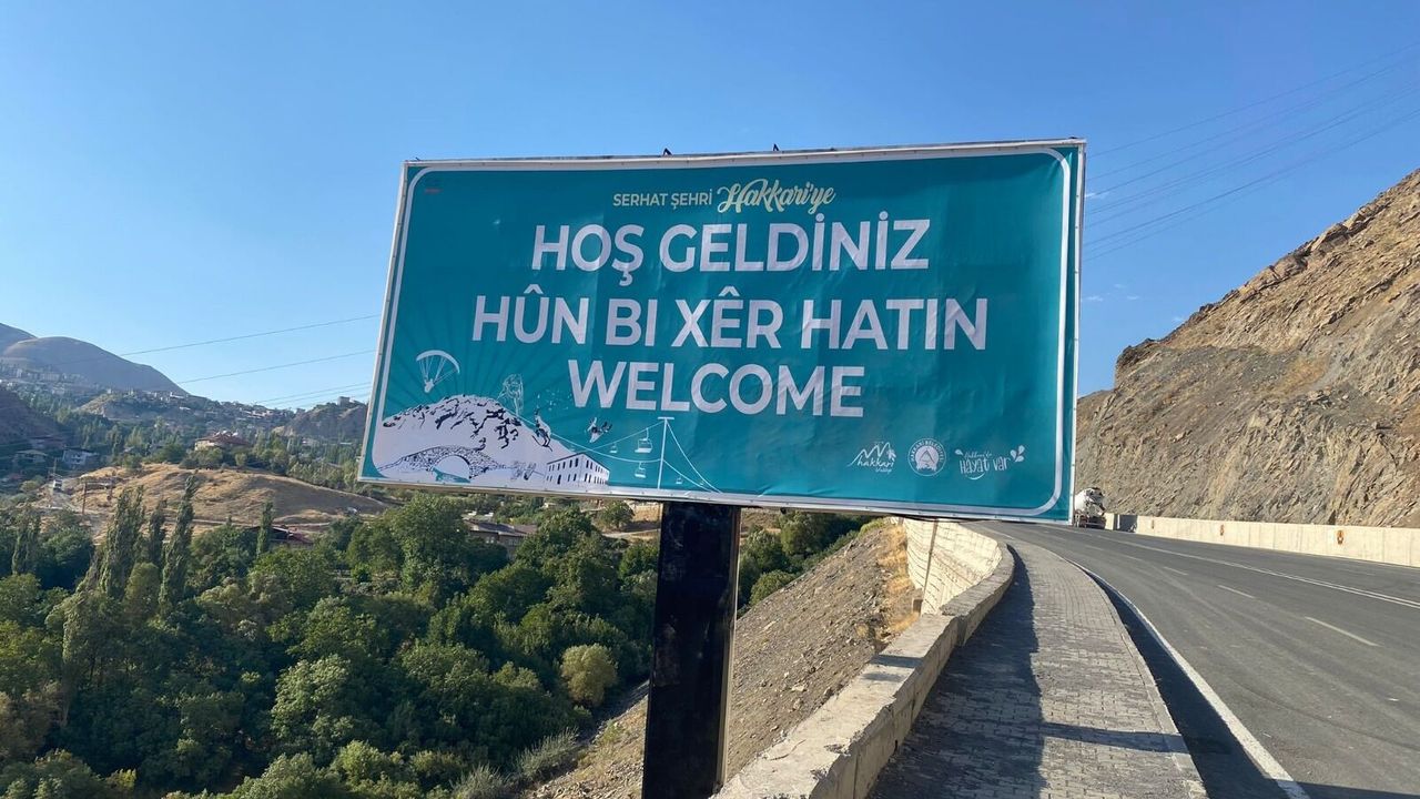 Tabelanın üzerinde ise Hakkari girişinde “Serhat Şehri Hakkari’ye Hoş Geldiniz, Hün bı xer hatın ve welcome” yazıları bulunuyor”