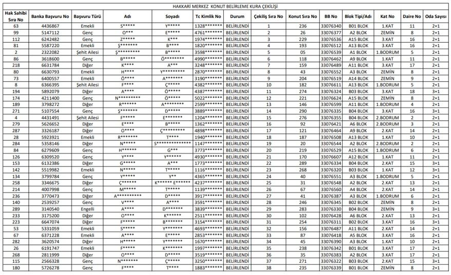 Toplu Konut İdaresi Başkanlığı (TOKİ) tarafından 250 Bin Sosyal Konut Projesi kapsamında Hakkari Merkez Gazi Mahallesi’nde yapılan 339 konutluk projede, kura yöntemiyle 292 konutun yeni sahipleri belirlendi. Hem 2+1 hem de 3+1 daireler için açıklanan isim listeleri büyük merak uyandırdı.