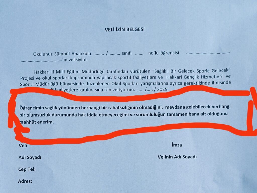 Hakkâri Milli Eğitim Müdürlüğü’nün okullara gönderdiği yeni taahhütname, veliler arasında büyük tepkiye yol açtı. “Sağlıklı Bir Gelecek Sporla Gelecek” projesi kapsamında öğrencilerin il içi ve gerektiğinde il dışındaki sportif faaliyetlere katılmasına izin verilmesini amaçlayan belge, içerdiği maddeler nedeniyle tartışma yarattı.