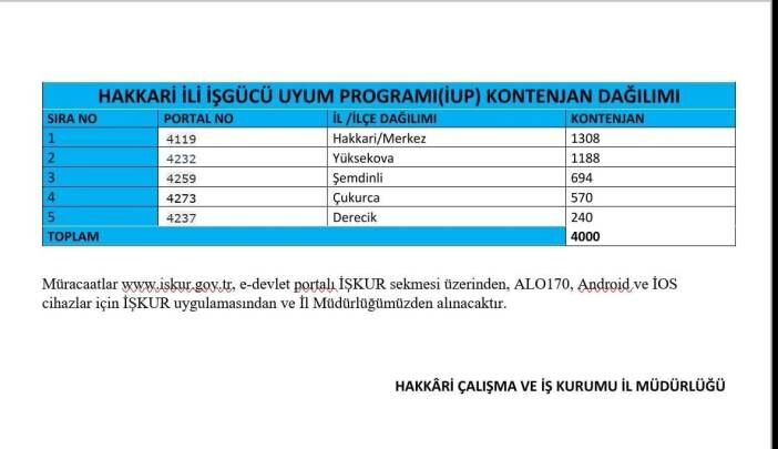 Hakkâri il merkezi ve ilçelerinde, İş Gücü Uyum Programı kapsamında 4 bin kişilik iş imkânı için başvurular alınmaya başlandı. Program, hem Hakkâri merkezde Valilik aracılığıyla hem de ilçelerde kaymakamlıklar üzerinden yürütülecek.
