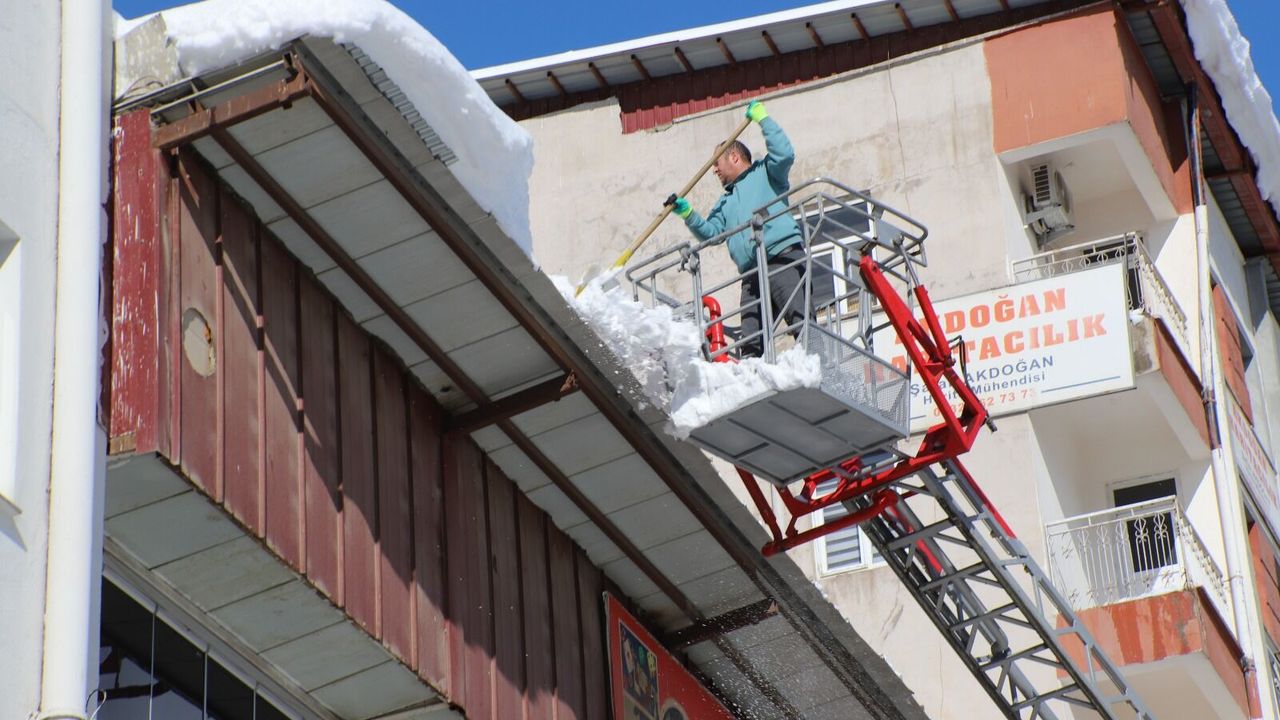 Özellikle çarşı merkezinde tehlike saçan çatılardaki karlar, itfaiye ekiplerinin merdivenli araçları yardımıyla kontrollü şekilde temizleniyor.