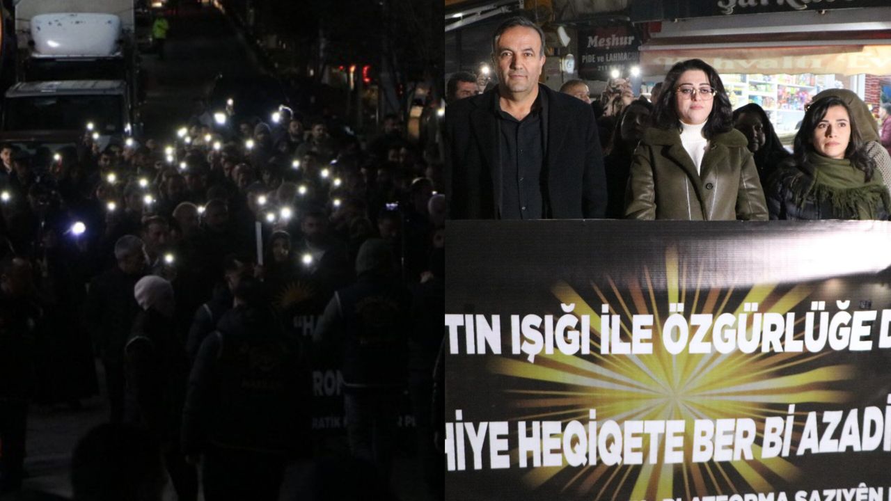 DEM Parti Hakkâri İl binası önünde toplanan kalabalık, ellerinde fenerler ve cep telefonlarının ışıklarıyla Bulvar Caddesi üzerinden yürüyüş gerçekleştirdi. Yürüyüşe DEM Parti Hakkâri Milletvekili Öznur Bartın, Dem Parti İl Eş Başkanları ve Görevden alınan Hakkari Belediyesi Eş Başkanı Viyan Tekçe'nin yanı sıra sivil toplum kuruluşu temsilcileri ve çok sayıda partili katıldı.