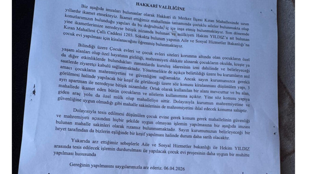 Hakkari merkez Kıran Mahallesi’nde yapılması planlanan “çocuk evi” projesi mahalle sakinlerinin tepkisine neden oldu. Bölgede uzun yıllardır ikamet eden vatandaşlar, projenin mevcut konumuna karşı çıkarak Hakkâri Valiliği’ne dilekçe verdi.