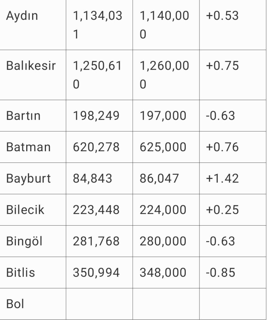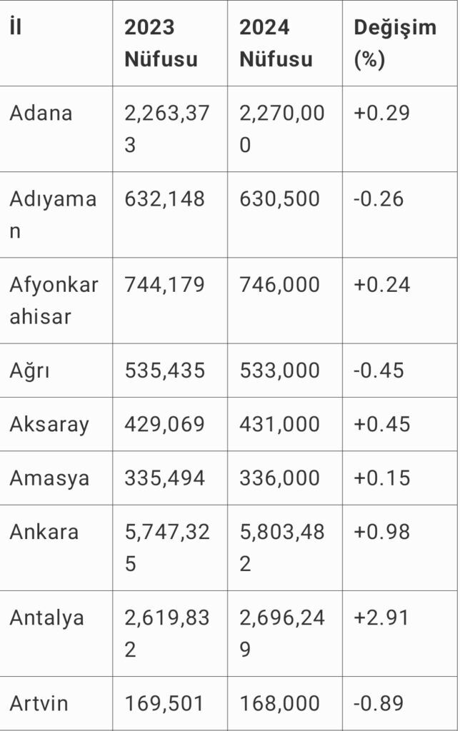Verilere göre Hakkari ve İstanbul'un nüfusunda azalma görülürken, özellikle Antalya, Ankara ve Bayburt gibi illerde artış kaydedildi. Nüfus yoğunluğu açısından ise İstanbul, kilometrekareye düşen 3 bin 13 kişi ile en yoğun il olmayı sürdürdü.