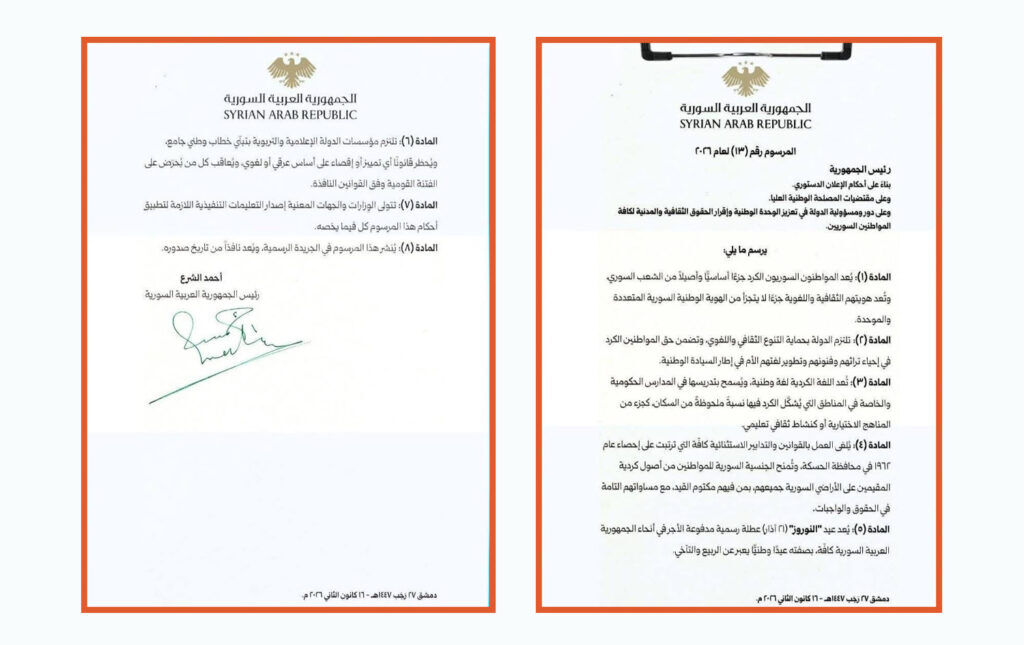 Suriye Geçici Cumhurbaşkanı Ahmed Şara, imzaladığı kararnameyle Kürtlere ilişkin bir dizi önemli düzenlemeyi yürürlüğe koydu.