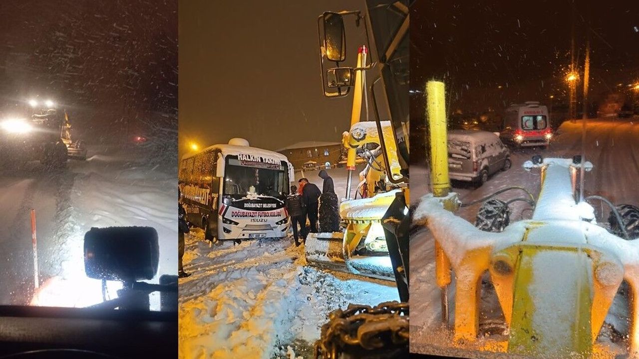 Olumsuz hava şartları nedeniyle bir ambulans ile Doğubeyazıt Spor Kulübü’nü taşıyan otobüs yolda mahsur kaldı. Durumun bildirilmesi üzerine belediye karla mücadele ekipleri hızla bölgeye sevk edildi.