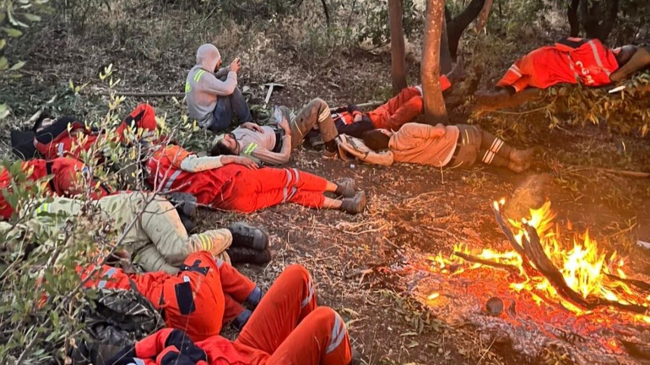 Alevlerle geçen saatlerin ardından yere uzanmış, gözlerini kapatmış ormancılar… Kimi kaskını yastık yaptı, kimi sırtını bir ağaca dayadı. Sessizliğin içindeki bu yorgunluk hali, aslında Hakkari Orman Müdürlüğü ekiplerinin gün boyu verdiği mücadelenin en yalın göstergesiydi.