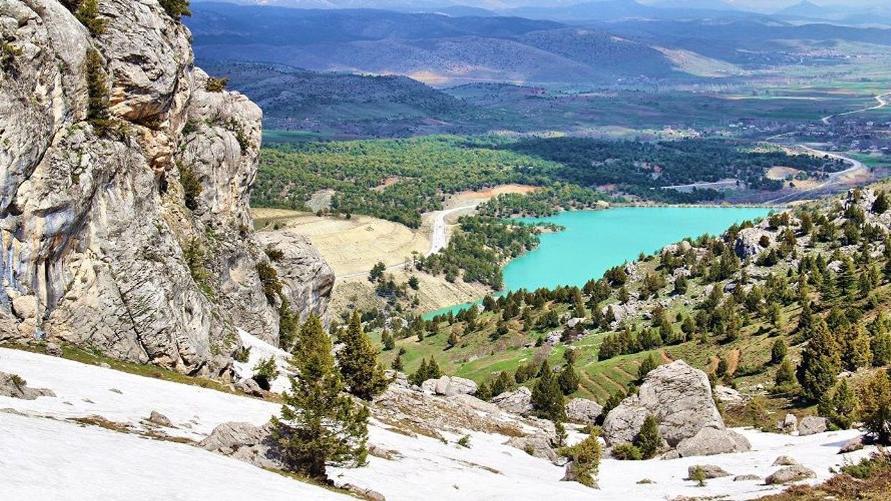 Kahramanmaraş’ta dağların arasında bulunan ve turkuaz rengiyle mest eden Değirmendere Göleti, görenleri kendine hayran bırakıyor.