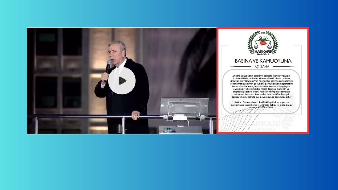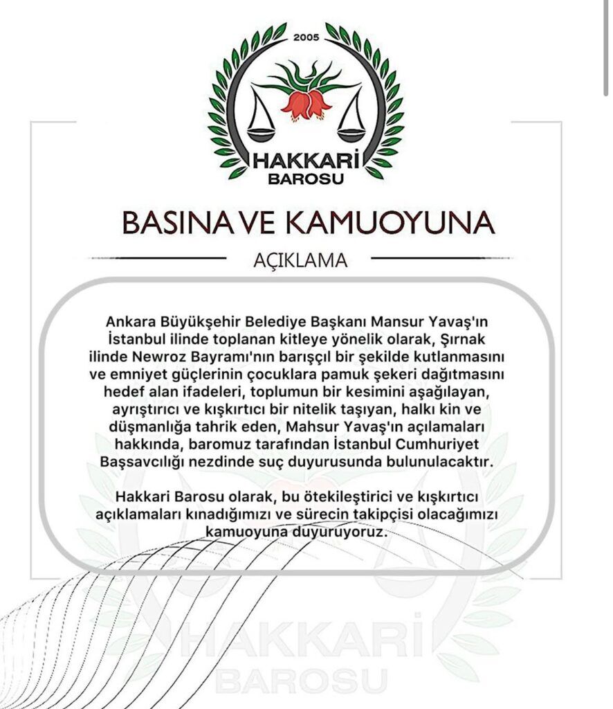 Hakkari Barosu, Ankara Büyükşehir Belediye Başkanı Mansur Yavaş'ın Şırnak'ta barışçıl bir şekilde kutlanan Newroz Bayramı ve emniyet güçlerinin çocuklara pamuk şekeri dağıtmasıyla ilgili ifadelerine tepki gösterdi. Baro, Yavaş’ın açıklamalarının toplumun bir kesimini aşağılayan, ayrıştırıcı ve kışkırtıcı bir nitelik taşıdığını belirterek, halkı kin ve düşmanlığa tahrik ettiğini vurguladı.