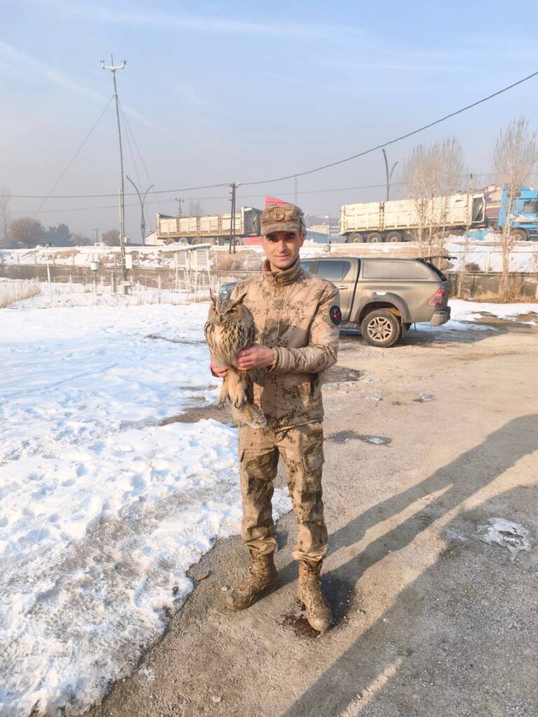 Hakkari İl Jandarma Komutanlığı’na bağlı Yüksekova Efeler Jandarma Özel Harekat Tabur Komutanlığı garaj bölgesinde, nesli tükenme tehlikesi altında bulunan Boynuzlu Baykuş yaralı halde bulundu. Duyarlı jandarma personelinin dikkati sayesinde fark edilen baykuş, vakit kaybetmeden muhafaza altına alındı.